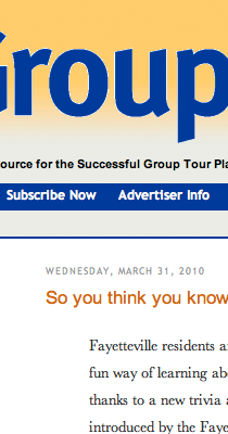GroupTour Magazine’s blog featured a March 31 post on the Fayetteville College of Patriotic Arts & Sciences’ Trivia Application. The quiz, which can be found on facebook, tests participants knowledge of the history of Fayetteville. Read more about it here