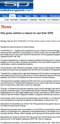 The Salisbury Post included the Greater Fayetteville GPS Trail Trek on its website May 3. The article explained the rules of the trail and the background of geocaching. http://www.salisburypost.com/News/050310-geocaching-in-fayetteville